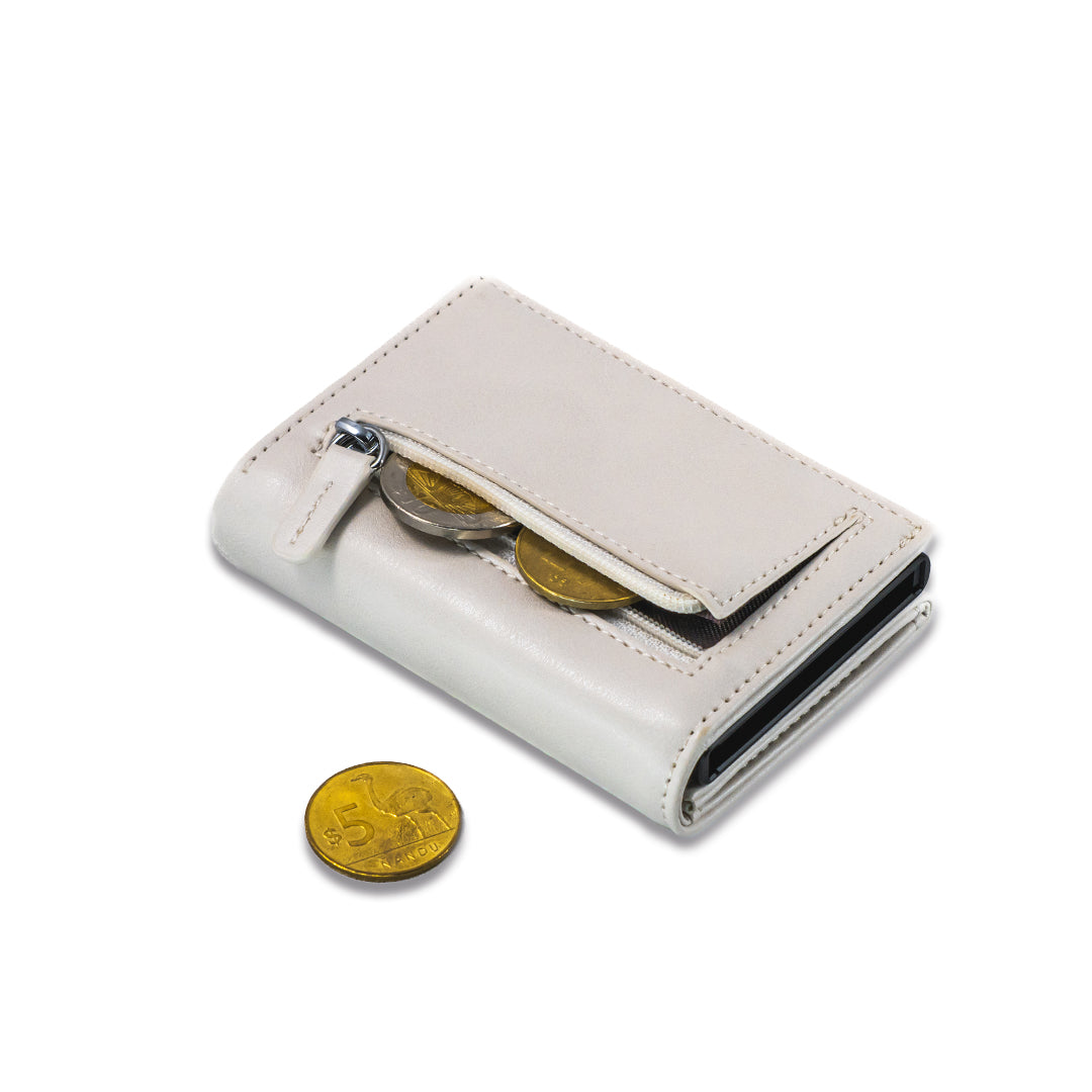 Diseñada para quienes valoran el detalle, esta billetera combina un look moderno con una estructura pensada para simplificar tu día a día. Su sistema de despliegue escalonado permite acceder a tus tarjetas con un solo movimiento, mientras el cuero marfil y el aluminio la convierten en una pieza elegante y funcional. Ideal para vos, o como un regalo especial.