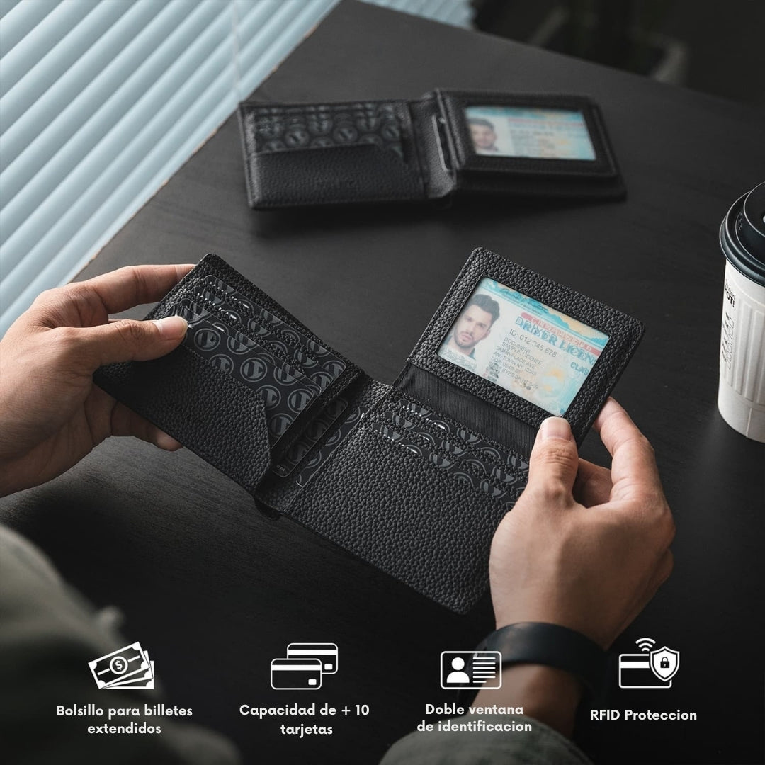 Cuenta con capacidad para hasta 13 tarjetas, compartimiento para libreta de conducir y de propiedad, y un amplio compartimiento para billetes. Todo en un formato compacto que se adapta a tu bolsillo.